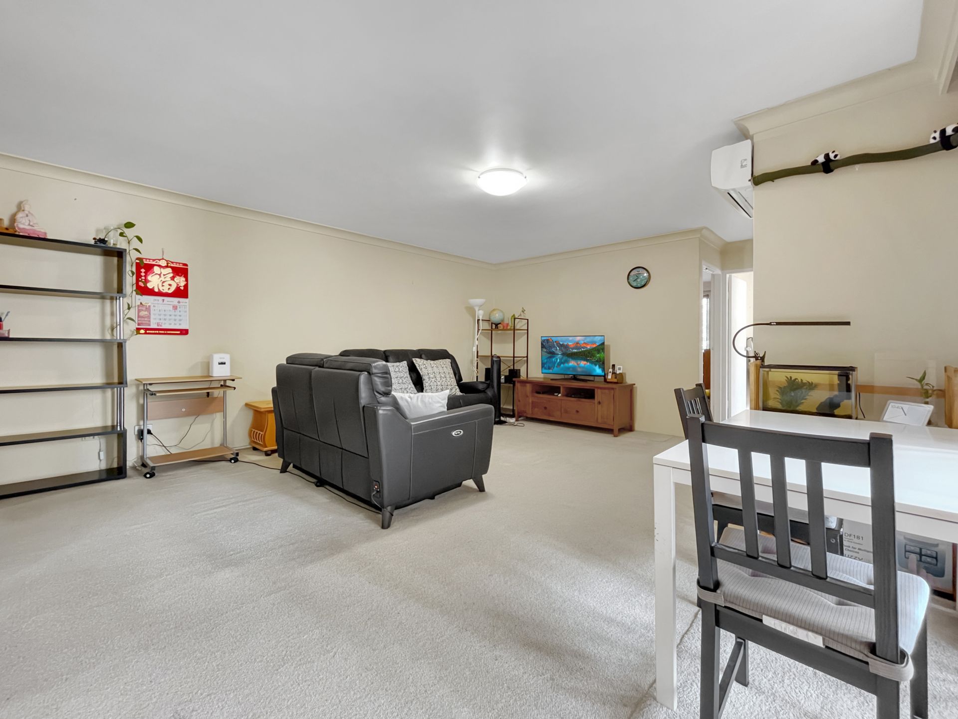 - Spacious living area with a split system air-con, flowing to the balcony with a leafy outlook