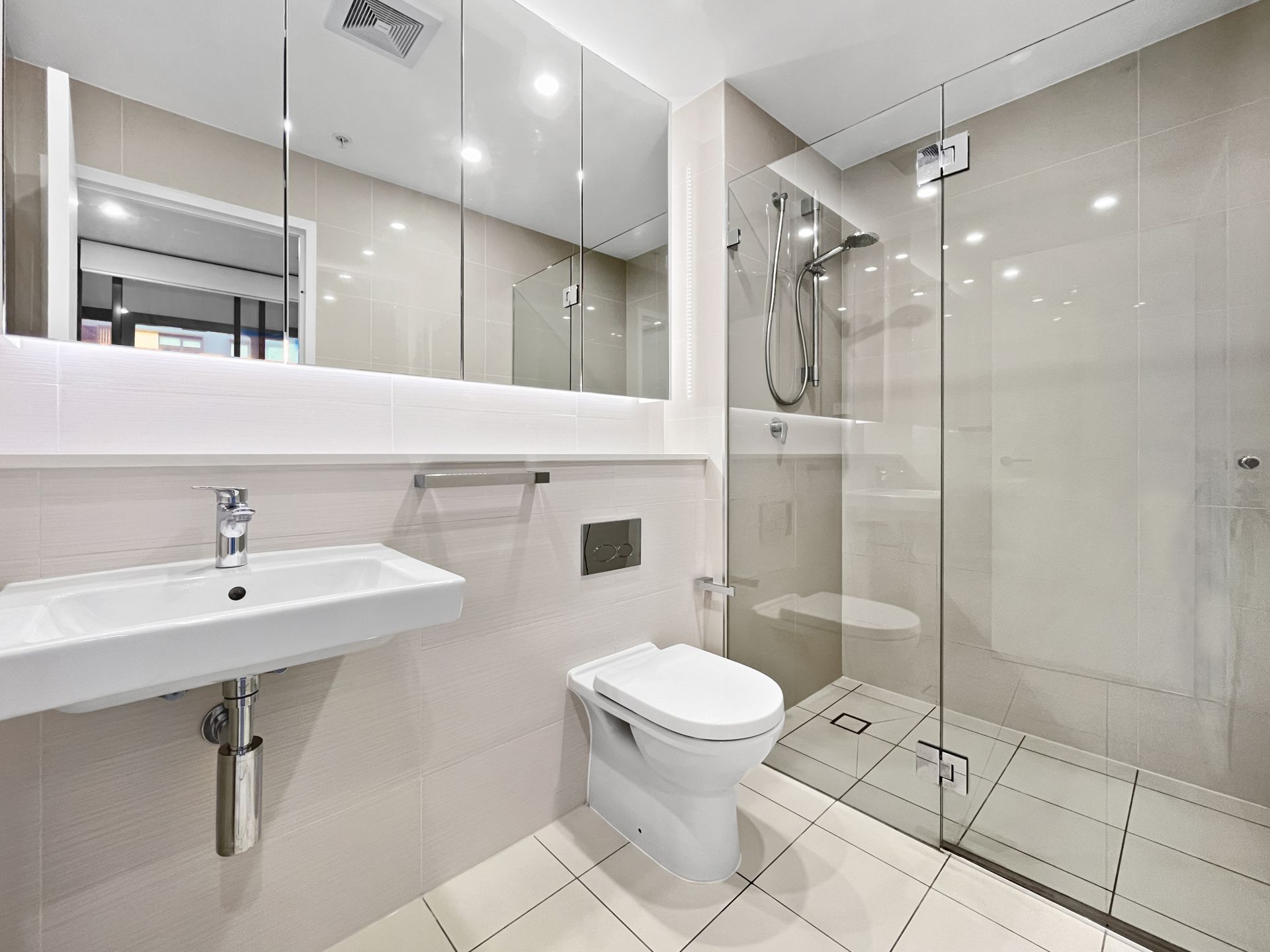 - Main bathroom with shower over bath and large mirrored medicine cabinet