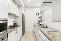 - Modern kitchen with gas cooktop, stone benchtops, and stainless steel appliances