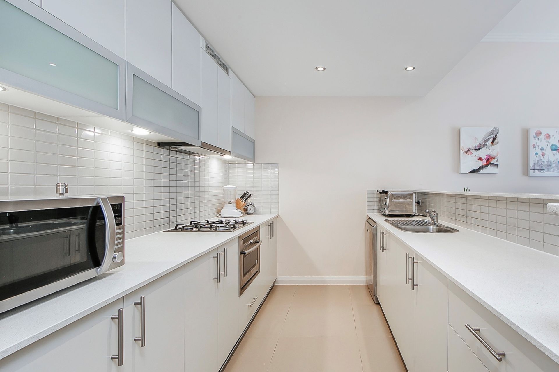 - Modern kitchen with stone benchtops, stainless steel appliances, gas cooktop and ample storage